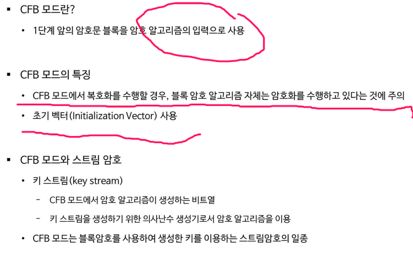 ํ๋จ๊ณ ์์ ์ํธ๋ฌธ ๋ธ๋ก์ ์ํธํ ์๊ณ ๋ฆฌ์ฆ์ ์ ๋ ฅ์ผ๋ก ์ฌ์ฉํ๋ค. CFB ๋ชจ๋์์ ๋ณตํธํ๋ฅผ ์ํํ ๊ฒฝ์ฐ ๋ธ๋ก ์ํธ ์๊ณ ๋ฆฌ์ฆ ์์ฒด๋ ์ํธํ๋ฅผ ์ํํ๊ณ ์๋ค๋ ์ ์ด ECB๋ CFB๋ชจ๋์๋ ๋ค๋ฅธ์ ์ด๋ค. ์ด๊ธฐ ๋ฒกํฐ๊ฐ ํ์ํ๋ฉฐ ํค์คํธ๋ฆผ ์ํธ์ด๋ค. ํค์คํธ๋ฆผ๊ณผ ํ๋ฌธ ๋ธ๋ก์ XOR ํ์ฌ ์ํธํ๋ฅผ ์งํํ๋ค.