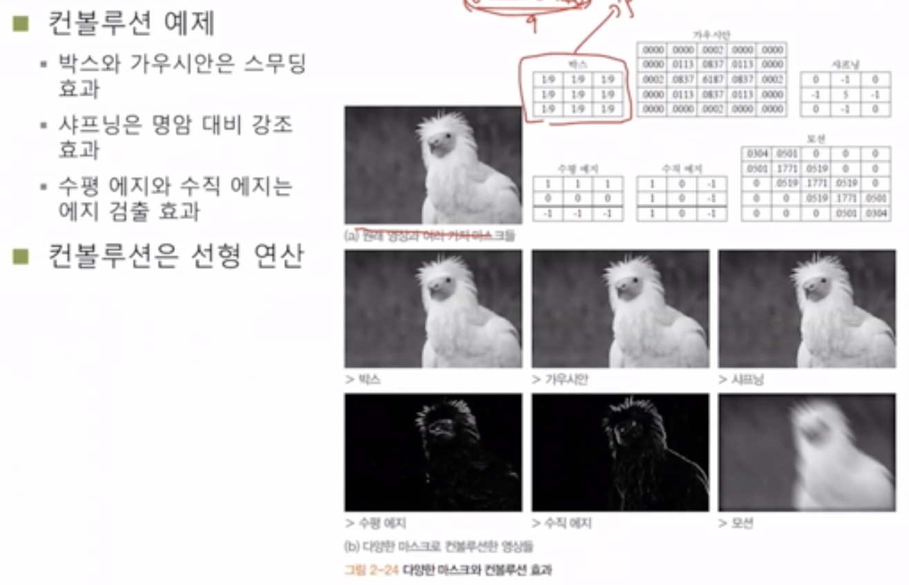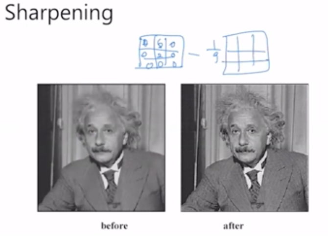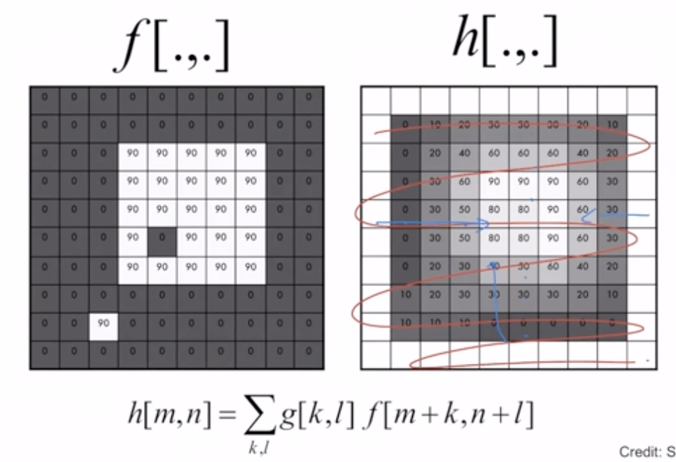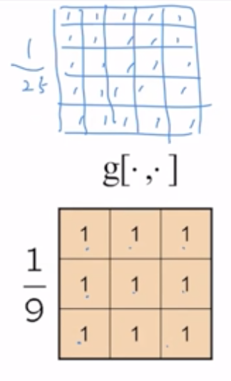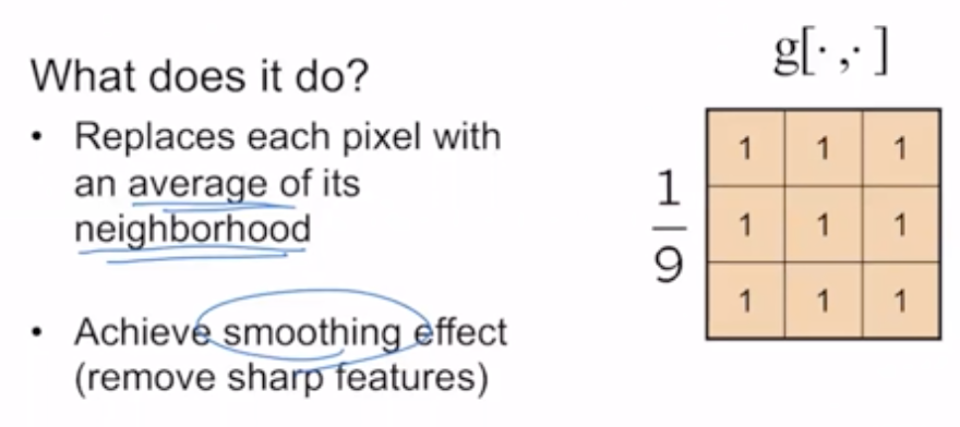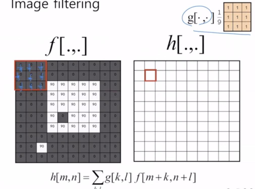 μ£Όμ΄μ§ μμμ gνν°λ₯Ό 컨볼루μ μνν λ, gλ₯Ό λ€μ§μ΄μ μ£Όλ³κ°λ€μ 1/9λ₯Ό κ³±νμ¬ λνκ°μ μλ‘μ΄ ν½μ κ°μΌλ‘ κ²°μ νλ€. μ£Όλ³κ°μ κ³ λ €νκΈ° λλ¬Έμ μλ³Έ μμμμ ν½μ κ°μ΄ 0μ΄μμμ§λΌλ μλ‘μ΄ μμμμλ ν½μ κ°μ΄ μκΈ°λ κ²½μ°κ° μ‘΄μ¬νλ€.