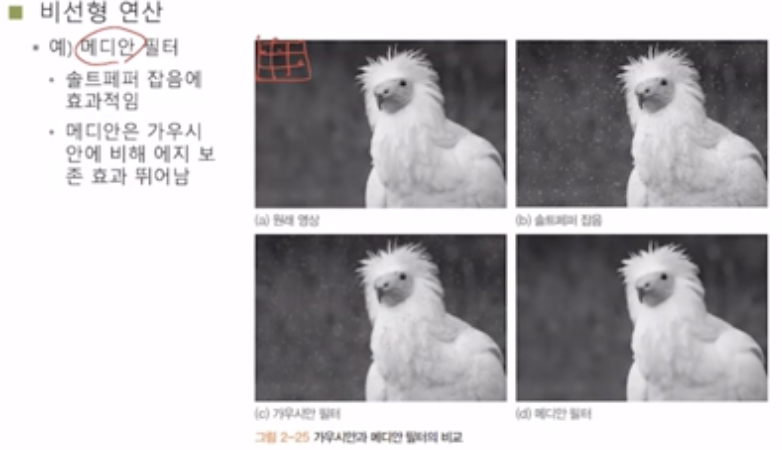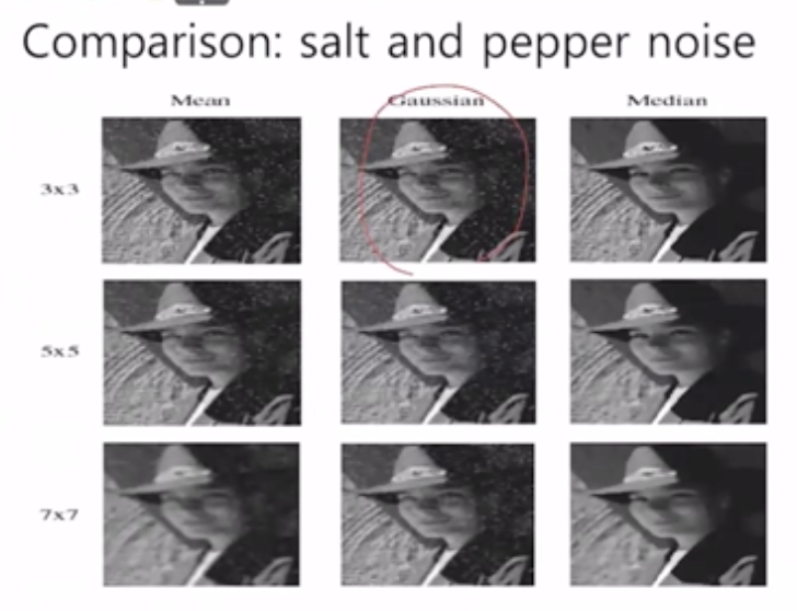 λ©λμ νν°μ μ₯μ μ μ£Όμ΄μ§ μμμμ μ‘μ(salt(ν°μ) and pepper(κ²μμ) noise(μ‘μ))μ΄ λ€μ΄λ λ νν° λ΄μμ 0μ΄λ 255κ° λμ μ μ€μκ°μΌλ‘ μ±μμ§κΈ° λλ¬Έμ noise λ₯Ό μ‘μ μ μλ€