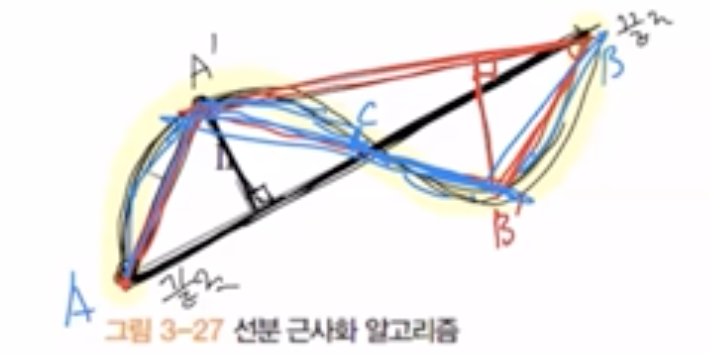 - ๊ณก์ ๊ณผ ์ง์ ์ฌ์ด์ ๊ฐ์ฅ ๊ฑฐ๋ฆฌ๊ฐ ๋จผ ์ง์ ์ A'์ ์ ํํ์ฌ ์ฌ๊ท์ ์ผ๋ก ์ง์ ์ ๊ตฌํด๋๊ฐ๋ค.