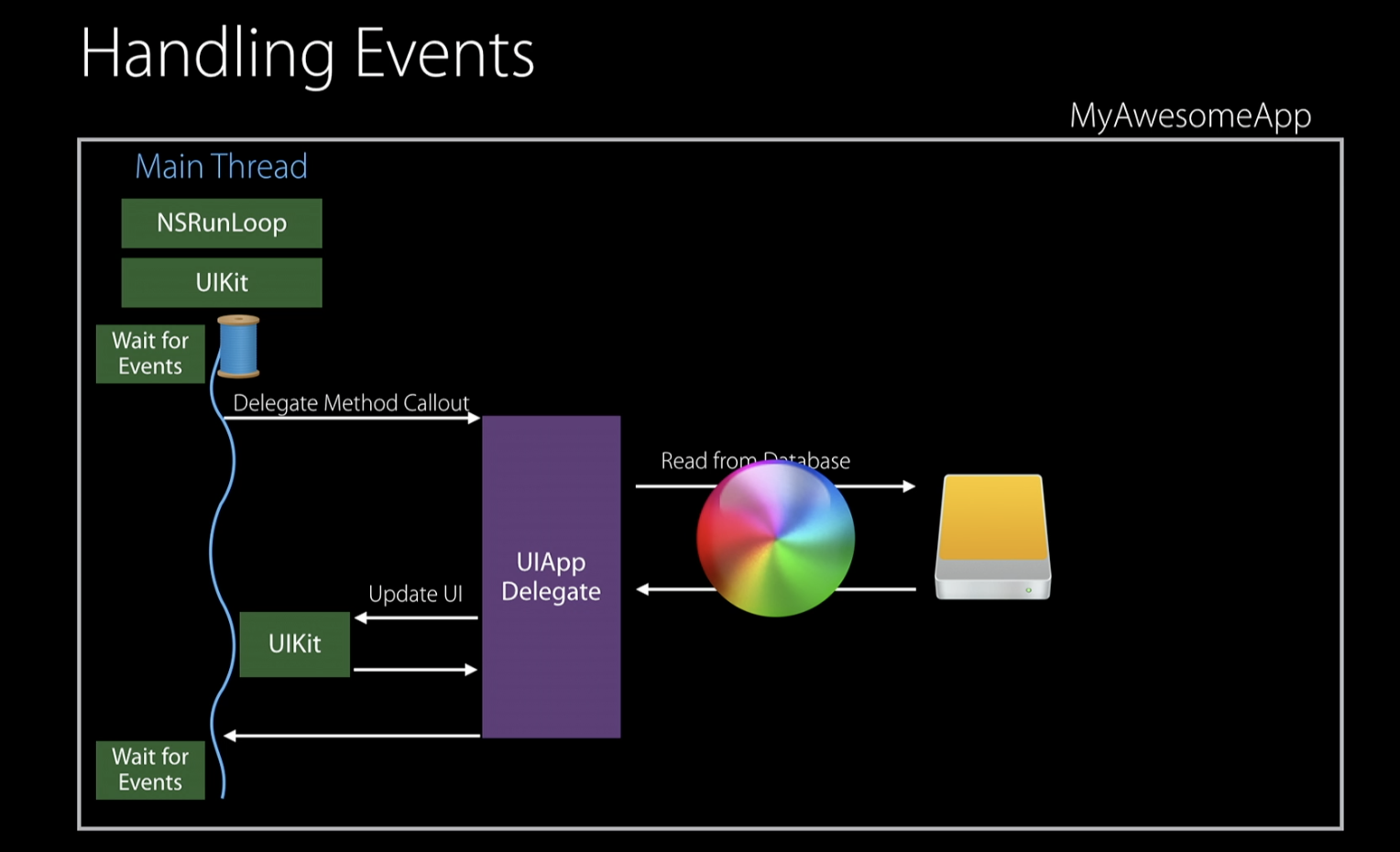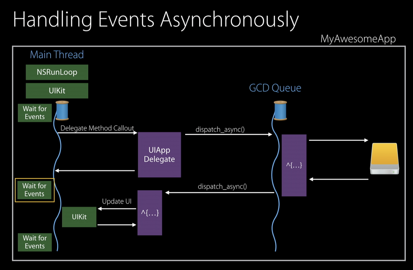 스레드는 실행중인 코드의 흐름을 관리해준다. 과거의 컴퓨팅 환경에서는 모든 코드가 단일 스레드 환경에서 실행되었지만 iOS와 같은 현대적인 운영체제에서는 여러가지 스레드가 여러 코드의 흐름을 동시에 실행시킬 수 있도록 지원해준다. (더군다나 오늘날의 멀티 코어 프로세서를 사용하면 스레드는 서로 다른 코어에서 실행될 수 있으나, 현재 사용하고 있는 컴퓨터가 싱글 코어일지라도 CPU 가상화를 통해 마치 동시에 실행되는 것처럼 보이는 환상을 준다) iOS 에서는 모든 사용자 인터페이스와 연관된 코드를 실행시킬 때에 main 스레드를 활용한다.