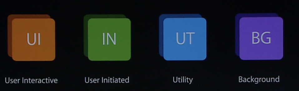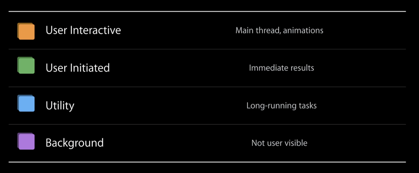근데 한번쯤 생각해볼 만한 부분이 있다! CPU가 하나인 상황에서 처리해야 하는 실행 흐름이 main thread 와 GCD 큐 두개가 있는 경우 어떤 스레드가 실행되어야할까? 이 문제를 해결하기위해 Quality of Service 클래스가 도입되었다. QoS 에는 다음과 같은 4가지 종류의 클래스가 정의되어있다.