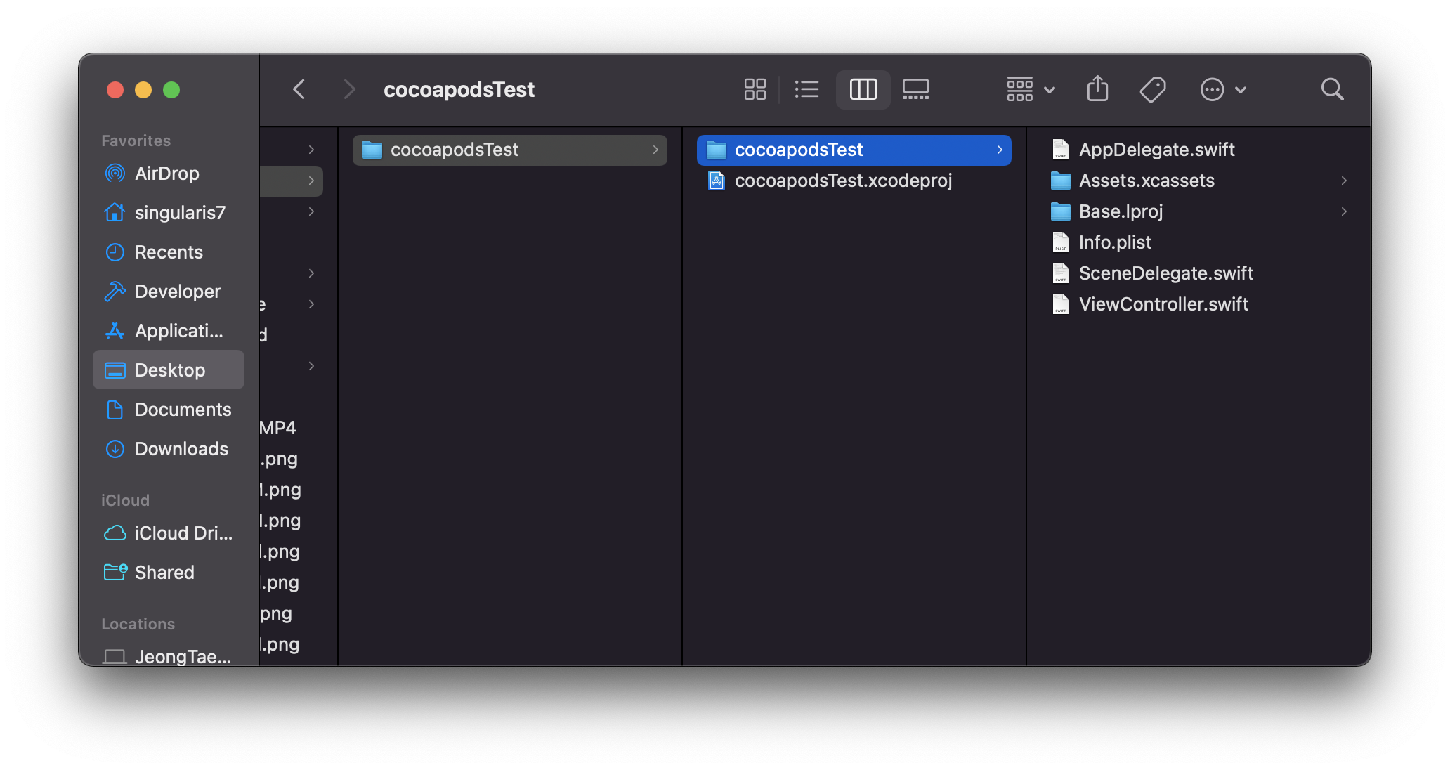 - 이전에 사용했던 프로젝트 번들이었던 .xcodeproj 확장자 외에도 .xcworkspace 확장자가 함께보입니다.