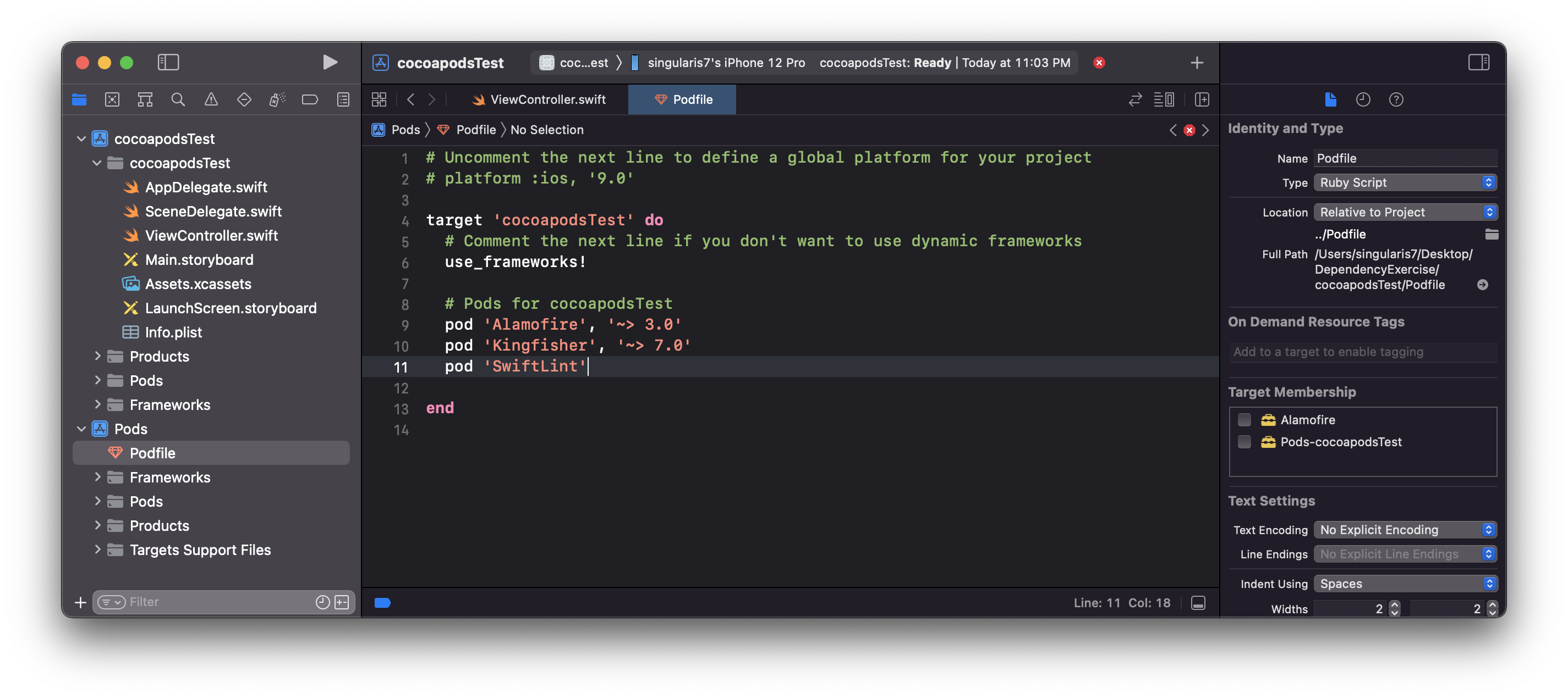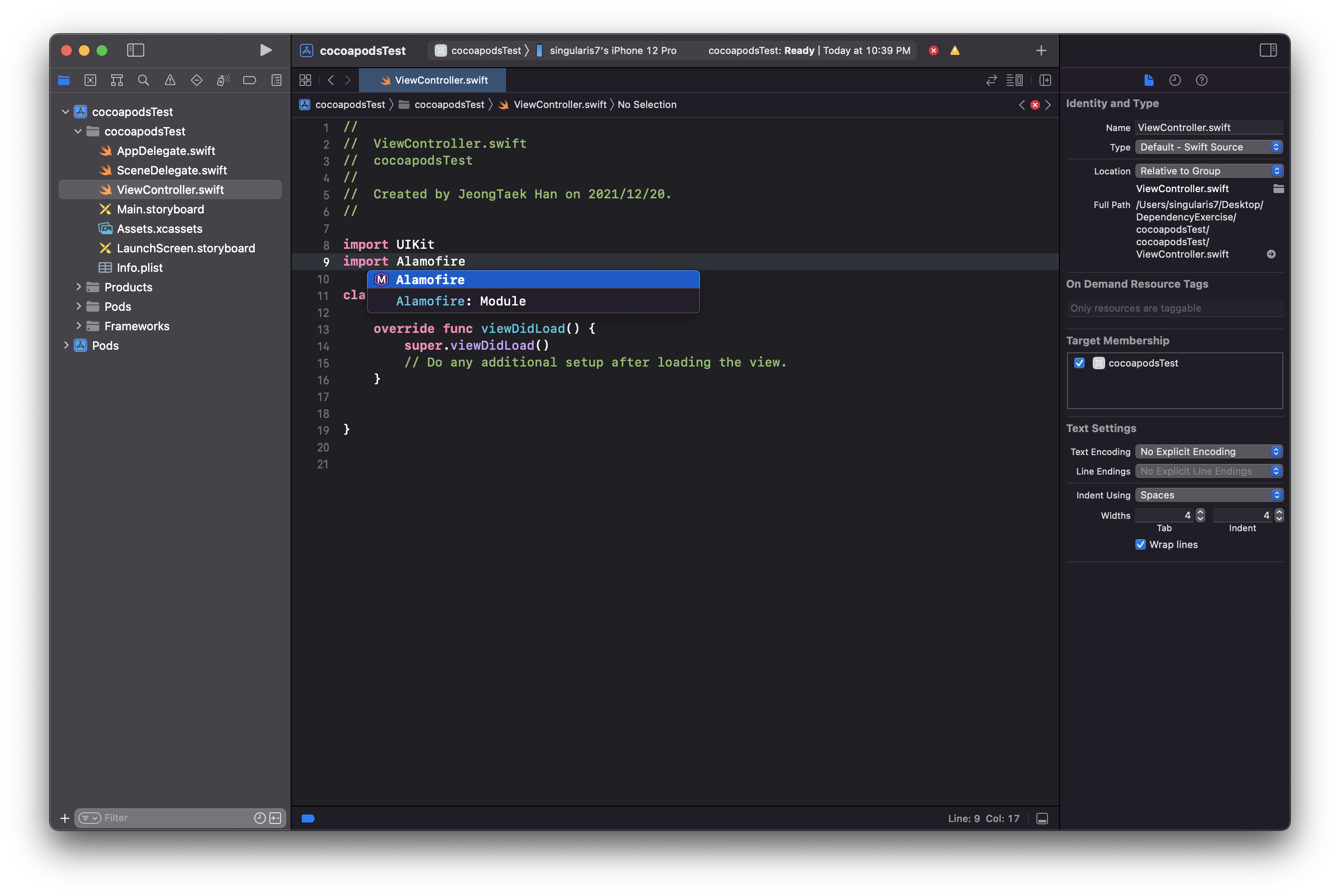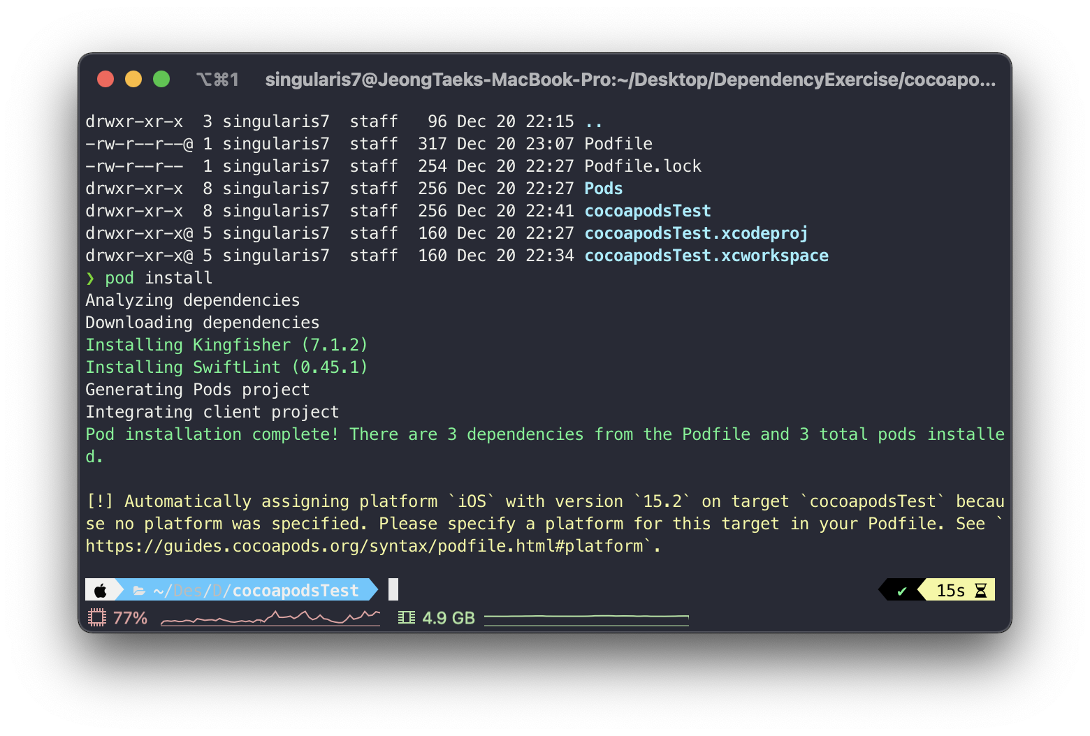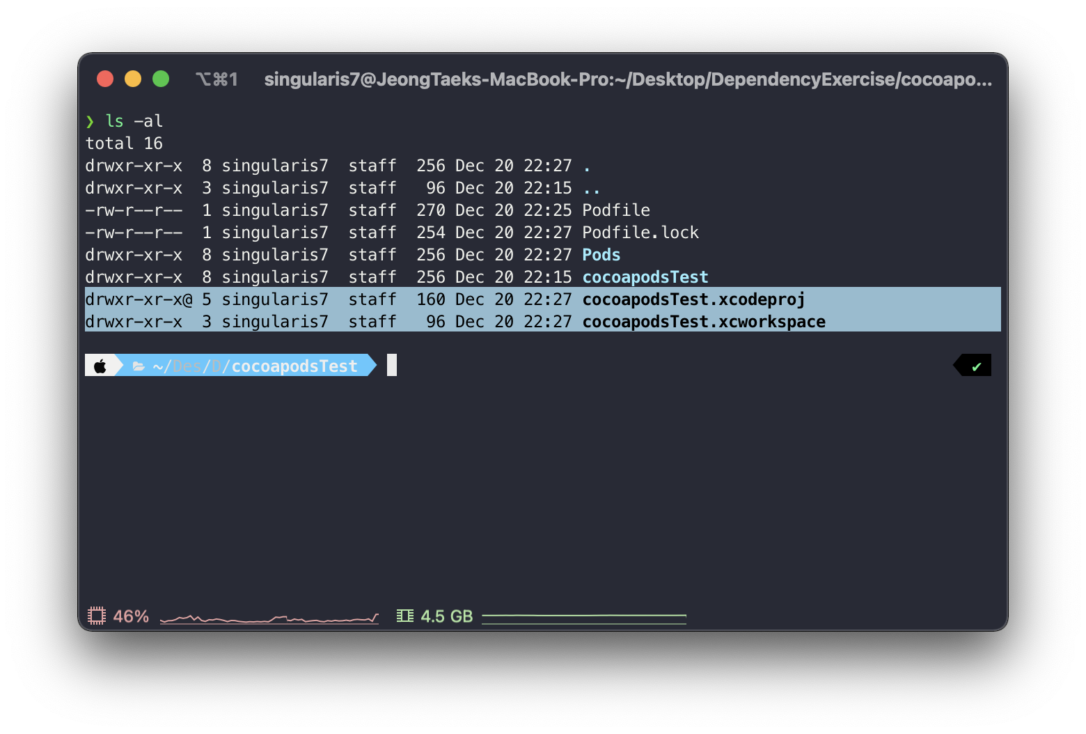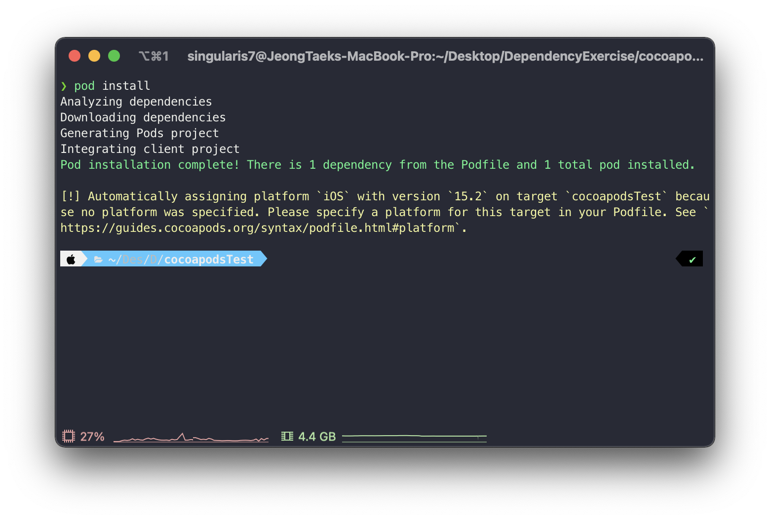 - 이전에 Podfile에 명시한 의존성을 설치하기 위해 사용한 pod install 을 한번 더 해줍니다.