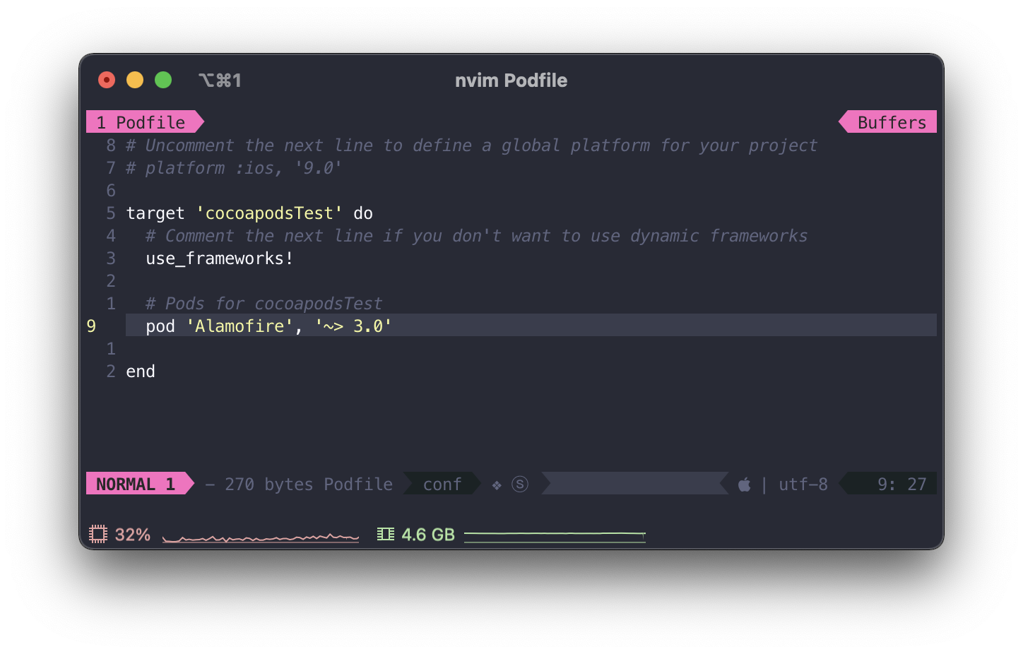 - 프로젝트를 생성한 디렉토리에서 pod init을 진행하면 Podfile 이 생성됩니다.