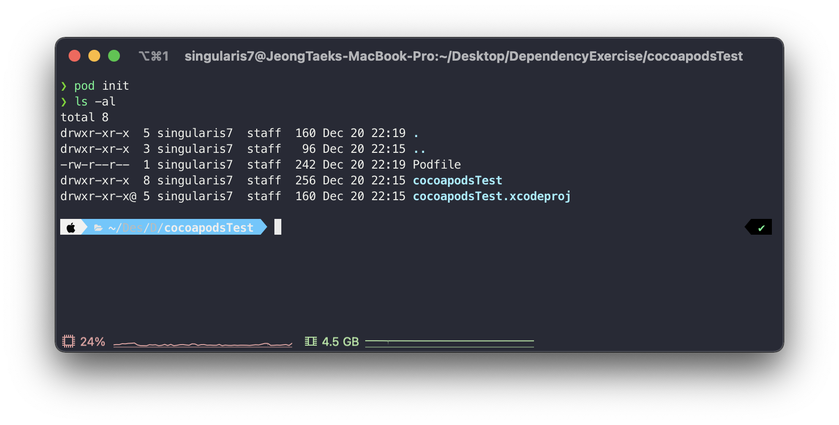 - pod install 입력하여 명시해준 의존성 코드를 다운로드 받아서 프로젝트와 연동해줄 수 있습니다.
